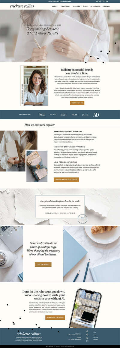 Crickette Collins is a sophisticated, stylish, and feminine Showit website template made for writers, designers, and creative small businesses who are ready for business to flourish.. It’s not just a website—it’s a mobile-friendly, customizable, strategically built platform that supports your sales goals and showcases your business.